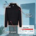 Discreet and easy to wear, it hides its features well: its kangaroo pocket lets you slip your hands in to keep them warm or keep your essentials close at hand. Indoors, when working from home or under a coat on a walk, it does the job. Simple, effective, without overheating.
